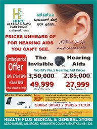 Bhatkal 26 June 2018: (Bhatkallys News Bureau) Hearing Health Care Clinic Bengaluru, a hearing aid company and clinic run by US based Morgenall company is organizing check up camp in Bhatkal for three days starting 26 June till 28 June at Health Plus Medical and General Store Azad Nagar here. Off