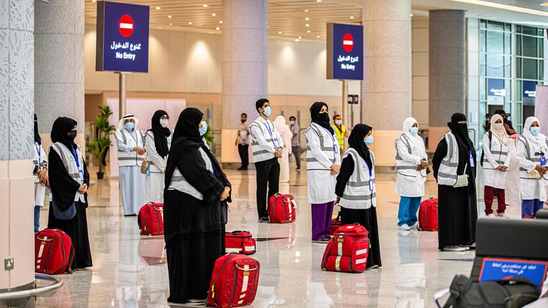 عازمینِ حج کا مکہ مکرمہ میں خیرمقدم، کووِڈ-19 سے بچاؤ کے لیے سخت احتیاطی اقدامات