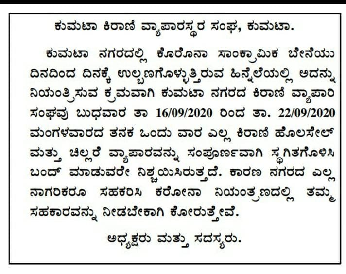 کمٹہ: 15 ستمبر، 20 (بھٹکلیس نیوز بیورو) کمٹہ میں کورونا کے معاملات میں روز بروز اضافہ کو دیکھتے ہوئے وہاں کے کرانہ دکانداروں کی تنظیم نے ایک ہفتے تک غذائی اشیاء فروخت کرنے والی تمام دکانوں کو بند رکھنے کا فیصلہ کیا ہے۔