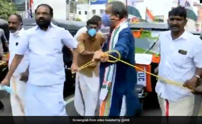 تیل قیمتوں میں اضافہ کے خلاف کانگریس کا دلچسپ احتجاج، تھرور نے رسی ڈال کر کھینچا آٹو رکشہ