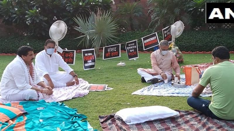 راجیہ سبھا سے معطل کیے جانے والے آٹھ ممبران پارلیمنٹ گذشتہ رات سے ہی پارلیمنٹ کے لان پر مظاہرہ کر رہے ہیں۔ راجیہ سبھا کے نائب چیئرمین ہریونش منگل کی صباح ان کے لئے چائے لے کر پہنچے تھے لیکن ارکان پارلیمنٹ نے احتجاجاً چائے پینے سے انکار کر دیا۔