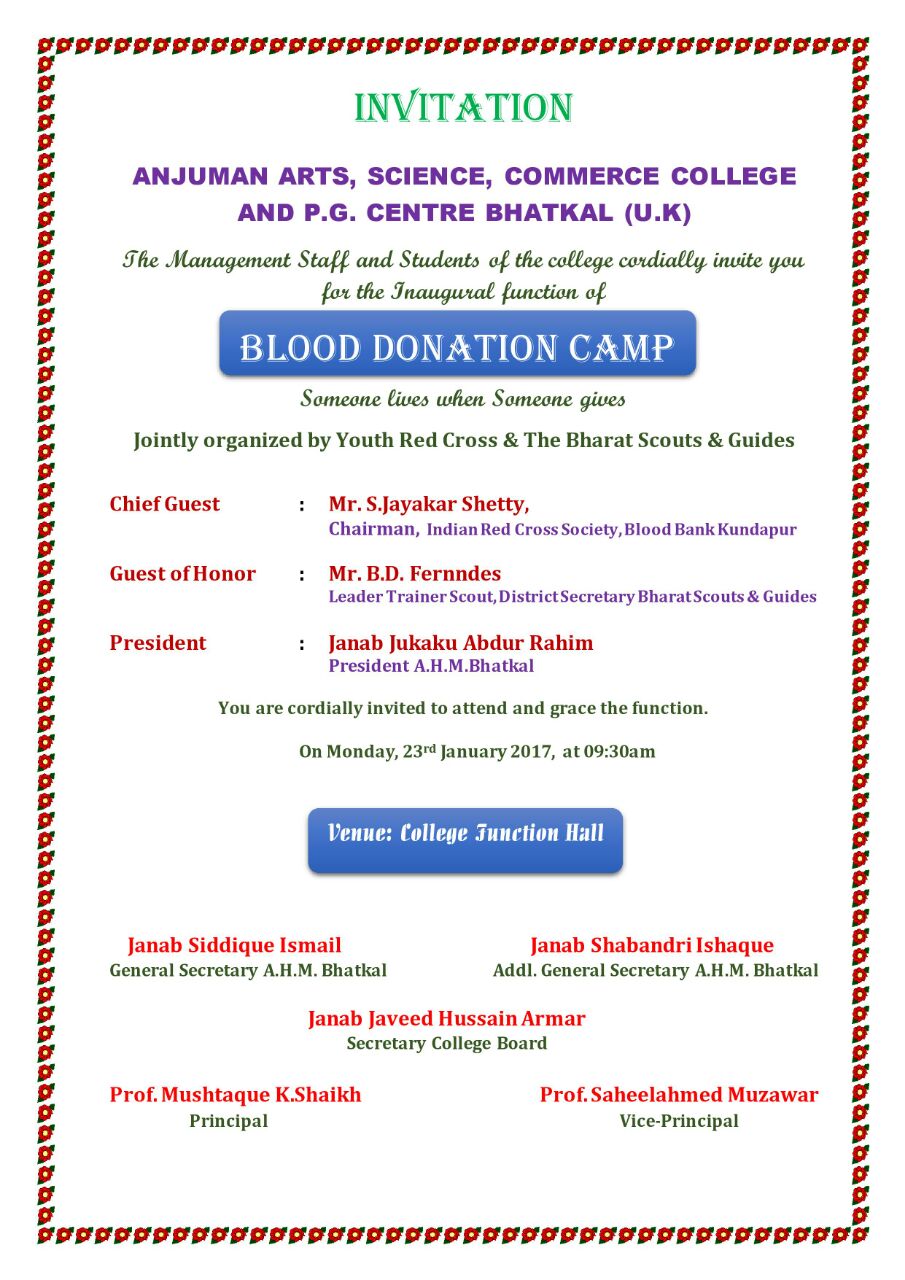 Bhatkal 22 January 2017: Anjuman Art, Science and Commerce college and PG Centre will be organizing an Blood donation camp in association with Youth Red Cross and Bharath Scout on Monday 23 January 2017 at the college function hall, which will is scheduled to begin at 9.30 am.