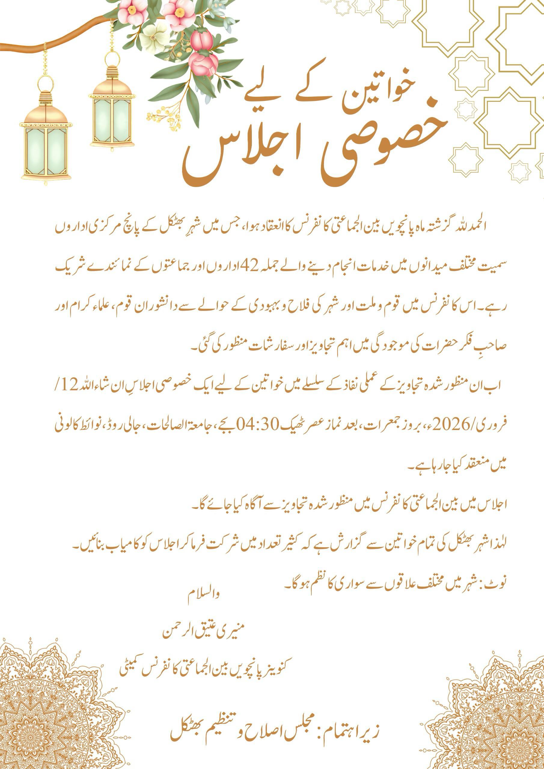 اطلاع کے مطابق اسی طرح کا ایک اجلاس مستورات کے لیے بھی 12 فروری 2026، جامعات الصالحات، جالی روڈ میں 4:30 بجے منعقد ہو گا جس میں خواتین کو ان تجاویز کے تعلق سے آگاہ کیا جائے گا۔