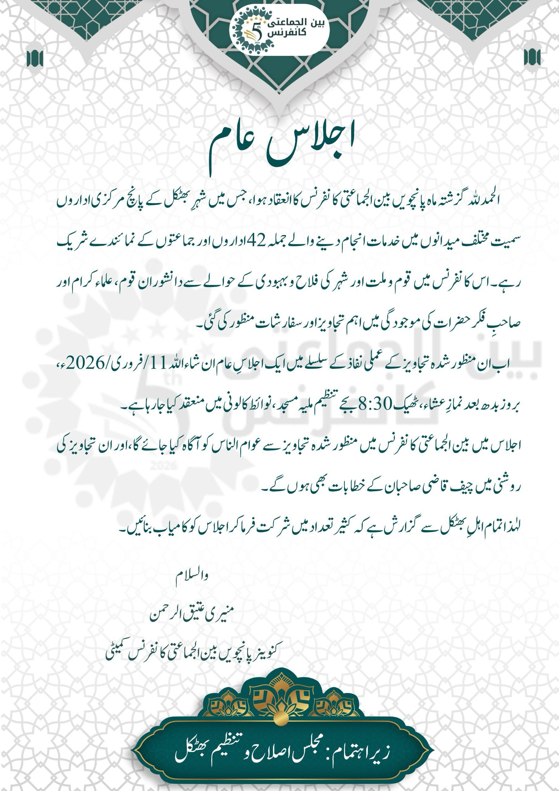 مورخہ: 11 فروری، بروز بدھ, 2026ساڑھے آٹھ بجے، بعد نماز عشاء تنظیم ملیہ مسجدمیں منعقد ہوگا۔اس کی اطلاع کنوینر بین الجماعتی کانفرنس میں پریس ریلیز جاری کرکے دی ہے۔