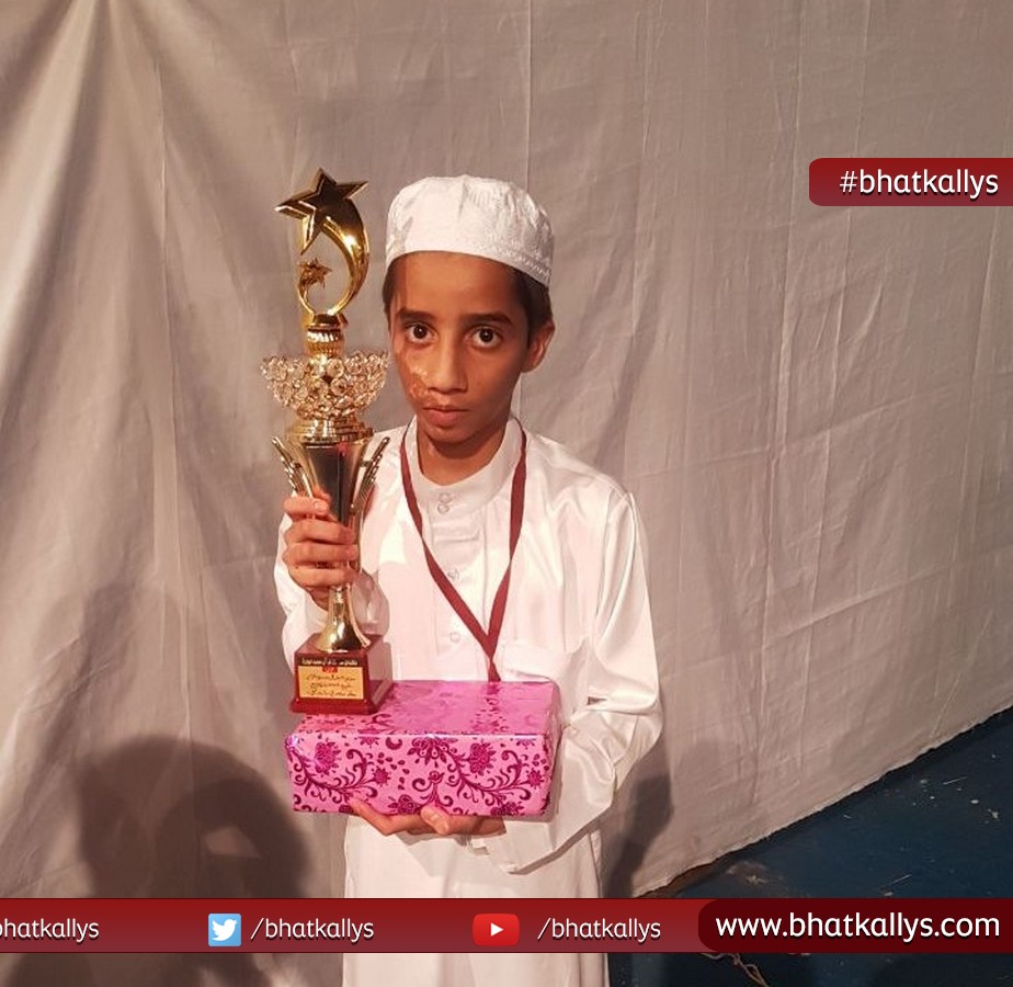 Jafer s/o Moulana Abdul Azeem Kazia(Vice Qazi, Jamatul Muslimeen Bhatkal) and a student of Maktab Jamia Islamia(Kargedde) has bagged first position in 'All India Qirat and Hifz Competition' while competing against 41 participants from across the country including 7 from his own hometown Bhatkal.