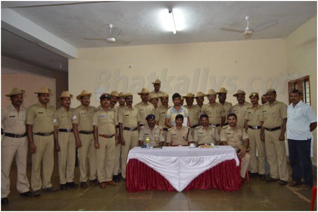 بھٹکل / (رضوان گنگاولی) پولس محکمہ بتر گیلّے ورسا چوری ، ڈکیتی انی دیگر جرائم چے مقدمات حل کیلّے انی تیجے بتر معاون زالّے پولس افسراں آز ہنگا سمودایا بھون ہالات منعقد ایک تقریب بتر اسسٹنٹ ایس پی مسٹر سدھیر ریڈی چے ہاتین ایوارڈ تقسیم کرون گیلے ۔