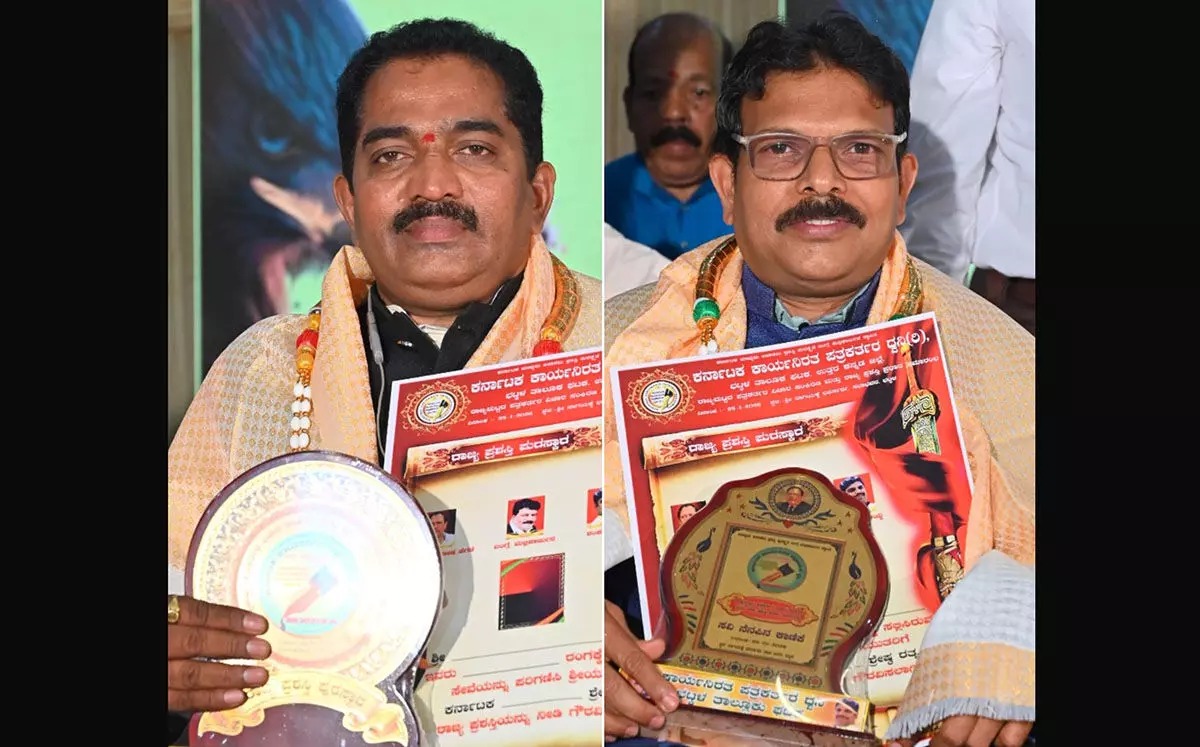 Bhatkal, January 30: (Bhatkallys News Bureau) Senior writer Gangadhara Naik and teacher–author Shridhar Shet were honoured with the Karnataka Sadhaka Shreshtha Ratna State Award at a state-level journalists’ conference and award ceremony held at the Nagayakshe Sabha Bhavan in Bhatkal.