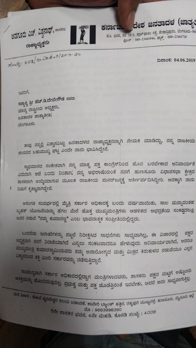 In his resignation letter to JD(S) supremo HD Deve Gowda, Vishwanath wrote, “You placed immense trust in me when you appointed me as the state president of the JD(S), and this has been my biggest accomplishment. I had to quit the Congress party, which was where my political journey began, in order to retain my self-respect. In such turbulent times, you stood by my side and invited me into your party like a friend.”