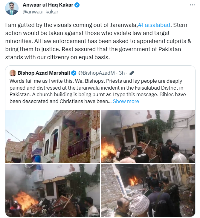 پاکستان کے نگراں وزیر اعظم انوارالحق کاکڑ کا اس معاملے میں کہنا ہے کہ سبھی لاء انفورسمنٹ کو قصورواروں کو پکڑنے اور انھیں انصاف کے کٹہرے میں لانے کے لیے کہا گیا ہے۔ مطمئن رہیں کہ پاکستان حکومت یکساں بنیاد پر ہمارے شہریوں کے ساتھ کھڑی ہے۔ کاکڑ نے یہ رد عمل چرچ آف پاکستان کے صدر بشپ آزاد مارشل کے ٹوئٹ کو شیئر کرتے ہوئے دیا ہے۔