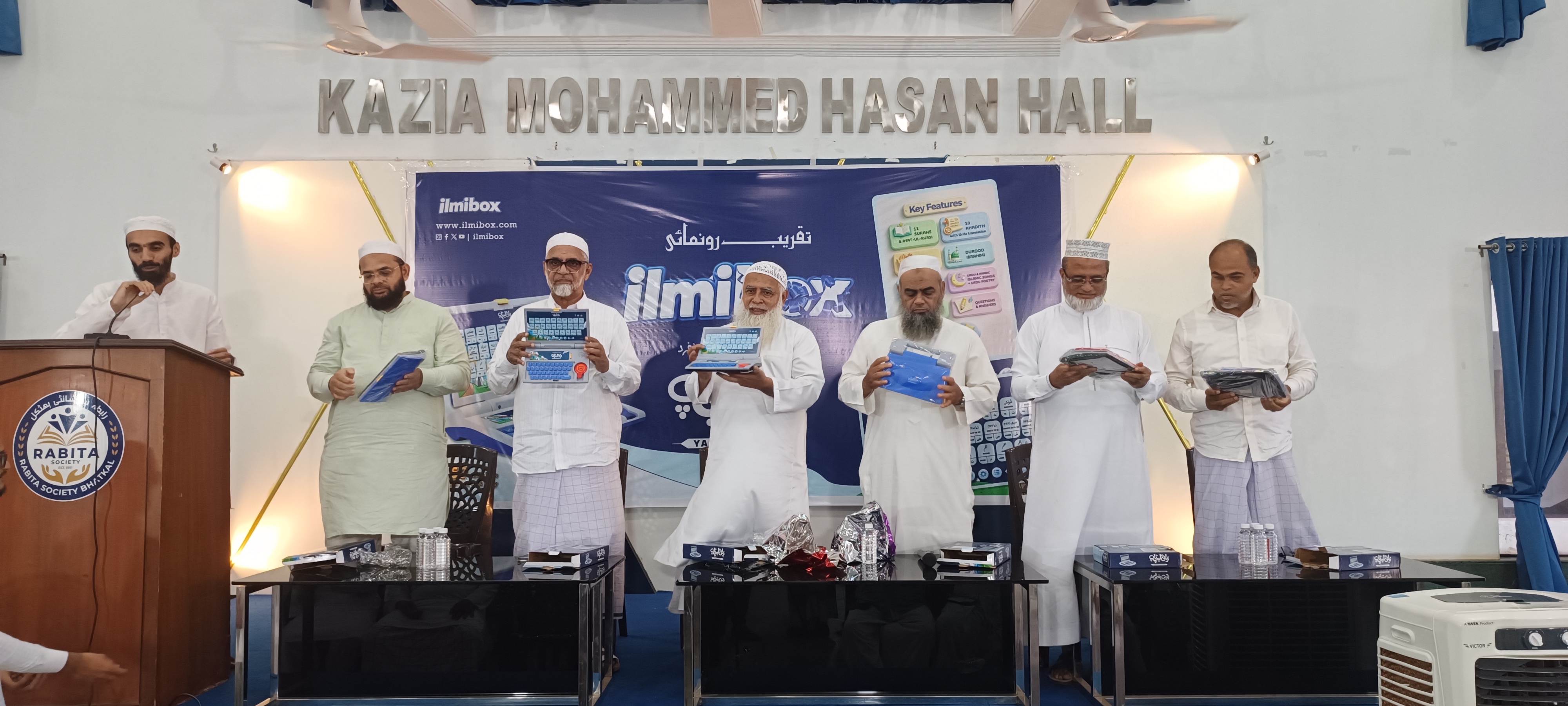 بھٹکل : 15 فروری 26 (بھٹکلیس نیوز بیورو) ادارہ ادبِ اطفال بھٹکل کے ذمہ داران کی جانب سے بچوں کو لغو اور بے کار چیزوں سے دور رکھنے کے لیے ایک متبادل کے طور پر علمی باکس کمپنی کے ذریعے تیار کیے گئے' یمانی لیپ ٹاپ' کی رونمائی تقریب رابطہ ہال میں منعقد ہوئی جس میں شہر کے قاضی صاحبان اور دیگر معززین کے ہاتھوں اس لیپ ٹیپ کی رونمائی کی گئی۔