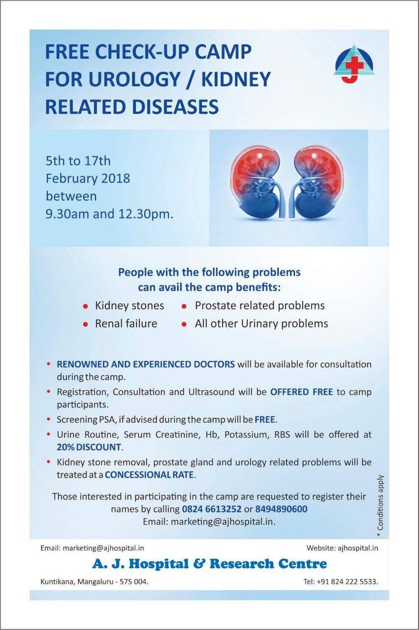 Mangaluru 30 Jan 2018: A free check up camp for UROLOGY and KIDNEY related diseases will be organised at A J Hospital & Research Centre from 5th to 17th February 2018 between 9:30am and 12:30pm wherein renowned and experienced doctors will be available for consultation, informed a press release by the hospital.