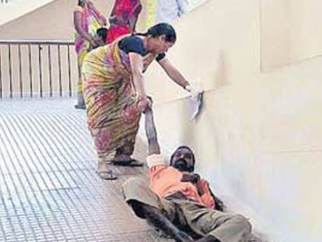 Indian media identified the patient as Srinivasa Chary, 45, who was shown being dragged by his wife to a government hospital's first floor for doctor consultation, in the Indian state of Andhra Pradesh.