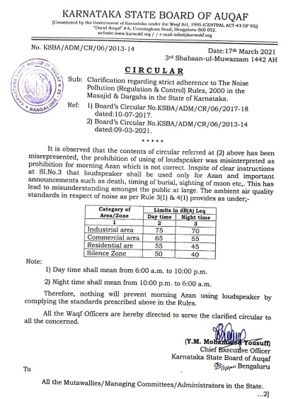 کرناٹک وقف بورڈ کے چیف ایگزیکٹو افسر وائی ایم محمد یوسف نے کہا کہ یہ کوئی نیا سرکلر نہیں ہے۔ بورڈ نے2017 میں اس طرح کا سرکلر جاری کرتے ہوئے تمام متولی اور مساجد کمیٹی کے ذمہ داروں کو صوتی آلودگی رولز 2000 پر عمل کرنے کی ہدایت دی تھی۔ چند مذہبی ادارے ان اصولوں پر عمل کرتے ہوئے آرہے ہیں، لیکن حال ہی میں کئی مقامات پر مسجدوں میں لاوڈ اسپیکرکے استعمال پر اعتراضات، تنازعات پیش آئے ہیں۔ یہاں تک کہ یہ معاملات عدالتوں تک پہنچ چکے ہیں۔ موجودہ حالات کو دیکھتے ہوئے دوبارہ اس سرکلرکو جاری کیا گیا ہے۔