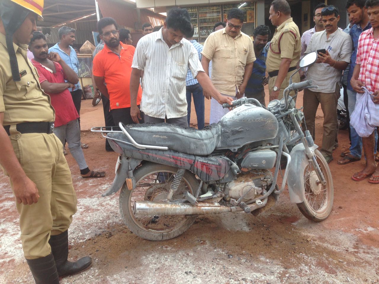 The owner of the bike parked outside Hotel Four Season, which soon caught fire instilling panic among the people nearby. Soon social worker of Bhatkal Nazir Kashimji, who was passing through NH66 managed to get the Fire Extinguisher DCP powder and got hold of the fire before the Fire Brigade team rushed to the spot.