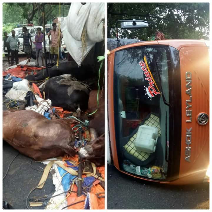 As per the sources, a truck carrying about 10 cattle was heading towards Kerala from Maharashtra. The incident took place when the driver lost control over the wheels allegedly due to over-speeding and toppled on NH-66 of Ankola.