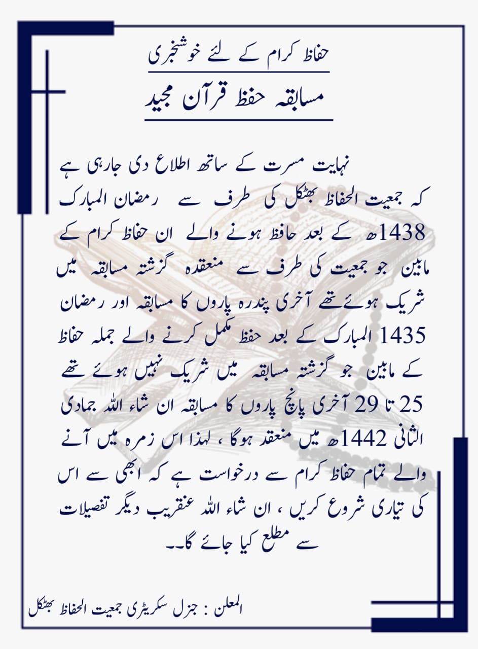 بھٹکل: 21 دسمبر، 20 (بھٹکلیس نیوز بیورو؍پریس ریلیز) نہایت مسرت کے ساتھ اطلاع دی جارہی ہے کہ جمعیت الحفاظ بھٹکل کی طرف سے رمضان المبارک 1438ھ کے بعدحافظ ہونے والے ان حفاظ کرام کے مابین جو جمعیت کی طرف سے منعقدہ گزشتہ مسابقہ میں شریک ہوئے تھے آخری پندرہ پاروں کا مسابقہ اور رمضان المبارک 1435ھ کے بعد حفظ مکمل کرنے والے جملہ حفاظ کے مابین جو گزشتہ مسابقہ میں شریک نہیں ہوئے تھے 25تا 29 آخری پانچ پاروں کا مسابقہ ان شاء اللہ جمادی الثانی 1442ھ میں منعقد ہوگا،لہذا اس زمرہ میں آنے والے تمام حفاظ کرام سے درخواست ہے کہ ابھی سے اس کی تیاری شروع کریں ، ان شاء اللہ عنقریب دیگر تفصیلات سے مطلع کیا جائے گا ۔