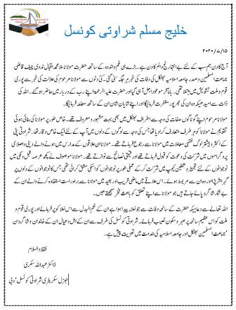 آپ کی رحلت سے آج پوری قوم ایک بیدار مغز اور زندہ دینی و سماجی رہنما سے محروم ہو گئی ہے.