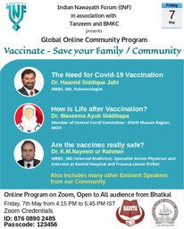 بھٹکل05؍اپریل2021(بھٹکلیس نیوز بیورو) انڈین نوائط فارم (آئی این ایف) کی جانب سے مجلس اصلاح وتنظیم بھٹکل اور بھٹکل مسلم خلیج کونسل کے تعاون سے کورونا ویکسین کے متعلق بیداری پیدا کرنے کے لیے7؍ مئی 2021ء کو زوم پر آن لائن پروگرام کا انعقاد کیا گیاہے جس میں اس میدان سے جڑے ماہرین اپنے خیالات ظاہر کریں