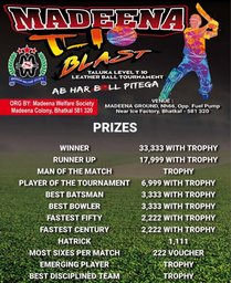 بھٹکل: 21 فروری،2021 (بھٹکلیس نیوز بیورو) مدینہ ویلفیر سوسائٹی کے زیراہتمام دس اووروں پر مشتمل تعلقہ سطح کا لیدر بال کرکٹ ٹورنامنٹ 'ٹی۔ٹین' سنیچر سے شروع ہوچکا ہے جس میں ہر دن چار چار میچس کھیلے جارہے ہیں۔بھٹکل آئیس فیکٹری کے قریب میدان میں منعقد اس ٹورنامنٹ میں تعلقہ بھر سے جملہ 31 ٹیمیں حص